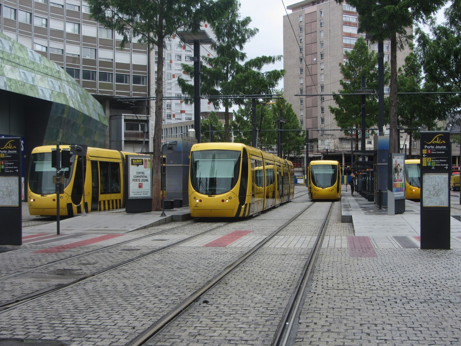 | Tram lines 1 and 3 traverse the historic streets of Mulhouse between the central station and the city centre. |